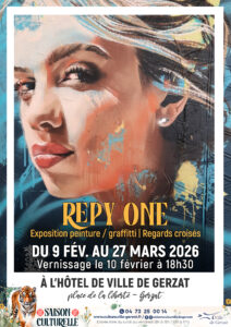 9 février 2026(1 évènement) Du lundi au vendredi de 8h à 12h et de 13h à 17h : Exposition Regards croisés par REPY ONE - Artiste graff Du lundi au vendredi de 8h à 12h et de 13h à 17h • Vernissage le mardi 10 février 2026 à 18 h 30 dans le hall de l’Hôtel de Ville de Gerzat, en présence de l'artiste • Entrée libre du lundi au vendredi de 8h00 à 12h et de 13h à 17h. Hall d’exposition de l’Hôtel de ville, au rez-de-chaussée, accès par la place de la liberté ou le parking des Remparts. Plonger dans un regard, c’est entrer dans une histoire. Celle qui ne s’écrit pas toujours avec des mots, mais avec des couleurs, des textures, des silences et des cris. REGARDS CROISÉS, ce sont des portraits qui percent la surface, peints à la bombe et à l’instinct, mêlant graffiti, art urbain et sensibilité brute. Chaque toile est une rencontre : intense, colorée, déroutante. Chaque portrait est une âme saisie entre deux mondes — celui du bitume et celui du dedans. Les visages sont grands, affirmés, presque insolents. Ils ne demandent pas la permission, ils s’imposent. Ici, la couleur n’est pas un choix esthétique : elle est vivante. Elle exprime ce que le regard ne peut contenir seul. Elle déborde, elle coule, elle éclabousse. Bienvenue dans un univers où les visages vous regardent autant que vous les regardez. Un échange direct, sans filtre, sans détour. Juste vous, eux, et la vibration du moment.