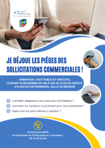 Le Centre communal d’action sociale (CCAS) de Gerzat et l’association UFC Que choisir Clermont-Ferrand vous propose une animation intitulée « Je déjoue les pièges des sollicitations commerciales » le mardi 18 novembre de 14 h à 16 h salle de réunion du CCAS, 1 er étage Pôle Social Jacques Decorps 4 place du Dr Pommerol . Inscriptions par téléphone au 04 73 23 55 46.