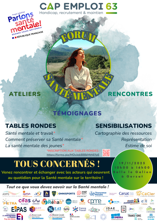 À l’occasion de la Semaine Européenne pour l’Emploi des Personnes Handicapées, Cap emploi 63, membre du Service Public de l’Emploi et du Réseau Pour l’Emploi, organise avec l’ensemble de ses partenaires un Forum exceptionnel dédié à la Santé Mentale le mercredi 19 novembre 2025, à la salle Le Galion de Gerzat. Ce forum vise à sensibiliser le public, les entreprises et les institutions à l’importance cruciale des enjeux de santé mentale dans l’emploi et l’insertion professionnelle des personnes en situation de handicap. Cet événement inédit, réunissant experts, témoignages, ateliers pratiques et espaces d’échanges, a pour objectif de lever les tabous, favoriser les bonnes pratiques, et renforcer les engagements pour un emploi inclusif. Il est ouvert à tous (grand public, employeurs, salariés, demandeurs d’emploi, professionnels de l’accompagnement et de l’insertion…). CONTEXTE ET ENJEUX Selon l’Organisation Mondiale de la Santé, en France, 1 personne sur 5 est concernée par un trouble psychique, soit près de 13 millions de personnes. Ces troubles – allant de l’anxiété légère à la dépression sévère – touchent de plus en plus les jeunes : 41 % des 18-24 ans présentent aujourd’hui des signes d’anxiété généralisée. Les conséquences sur le monde du travail sont lourdes : les troubles psychiques représentent 35 à 45 % de l’absentéisme, et 1 salarié sur 4 se déclare en mauvaise santé mentale. Dans le Puy-de-Dôme, 40 % des licenciements pour inaptitude sont directement liés au burn-out ou à l’épuisement professionnel. Et pourtant, la santé mentale reste encore trop taboue, notamment dans le monde professionnel. Face à ce constat, Cap emploi 63, acteur du service public de l’emploi spécialisé dans l’accompagnement des personnes en situation de handicap, et ses partenaires organisent un Forum Santé Mentale le mercredi 19 novembre, à la salle Le Galion à Gerzat. Ouvert à tous (grand public, employeurs, salariés, demandeurs d’emploi, professionnels de santé et de l’accompagnement), cet événement vise à ouvrir le dialogue, partager des solutions concrètes et renforcer les coopérations locales autour d’un enjeu de santé publique majeur. Au programme : tables rondes interactives, ateliers pratiques, animations participatives et interventions d’experts, pour comprendre les enjeux actuels et découvrir des leviers d’action. Le forum mettra en lumière des initiatives et bonnes pratiques en matière de : • Prévention des risques psychosociaux (RPS) à tous les niveaux de l’entreprise • Adaptation des environnements de travail pour plus d’inclusion et de bienveillance • Accompagnement individualisé des personnes concernées • Accès aux droits, au soin et au maintien en emploi • Innovation et expérimentation dans les pratiques professionnelles • Participation des personnes concernées à la construction des réponses La santé mentale a été désignée Grande cause nationale en 2025, confirmant son importance croissante dans notre société. On estime aujourd’hui que 7,5 % des Français ont souffert de dépression au cours des 12 derniers mois. Acteur engagé au quotidien, Cap emploi 63 mobilise l’ensemble des partenaires locaux pour promouvoir des pratiques vertueuses en matière de maintien en emploi, d’inclusion professionnelle et de soutien des parcours. Ce forum s’inscrit pleinement dans cette dynamique. La santé mentale nous concerne toutes et tous. Ce forum est une invitation à comprendre, à échanger, et surtout à agir ensemble. PARMI LES TEMPS FORTS : • Des tables rondes sur la santé mentale au travail, sur sa préservation et sur la santé mentale des jeunes. • Des ateliers thématiques • Des animations ludiques et interactives pour favoriser les échanges et libérer la parole. Chaque visiteur recevra un livret détaillé pour faciliter sa participation, sa découverte des différents stands et ses démarches. INFORMATIONS PRATIQUES : • Entrée libre et gratuite, • Mercredi 19 novembre 2025, 10h00 - 16h00, • Salle Le Galion à Gerzat PROGRAMME DE L’ÉVÈNEMENT : • 09h00 : Accueil des exposants et partenaires • 10h00 : Ouverture officielle du forum • 10h30 : Table ronde « Santé mentale et travail » • 11h45 : Visite des Officiels • 12h00 – 13h00 : Pause méridienne • 13h00 : Table ronde « Comment préserver sa santé mentale » • 14h30 : Table ronde « La santé mentale des jeunes » • 16h00 : Conclusion et perspectives Cap emploi 63 réaffirme ainsi son engagement en faveur d'une meilleure compréhension et prise en charge des enjeux liés à la santé mentale et à l’insertion professionnelle. PARTENAIRES PRESENTS ADPS Formation AGEFIPH AIST 63 APEC ASM Omnisports Avenir Actifs CAP EMPLOI 63 CARSAT CECLER CFAS CHU Centre expert CPME DAC 63 DDETS Dispositif Emploi Accompagné Le Galion Place Marcel Collange Gerzat, 63360 | 20 novembre 2025 | 21 novembre 2025 | 22 novembre 2025 | 23 novembre 2025 |