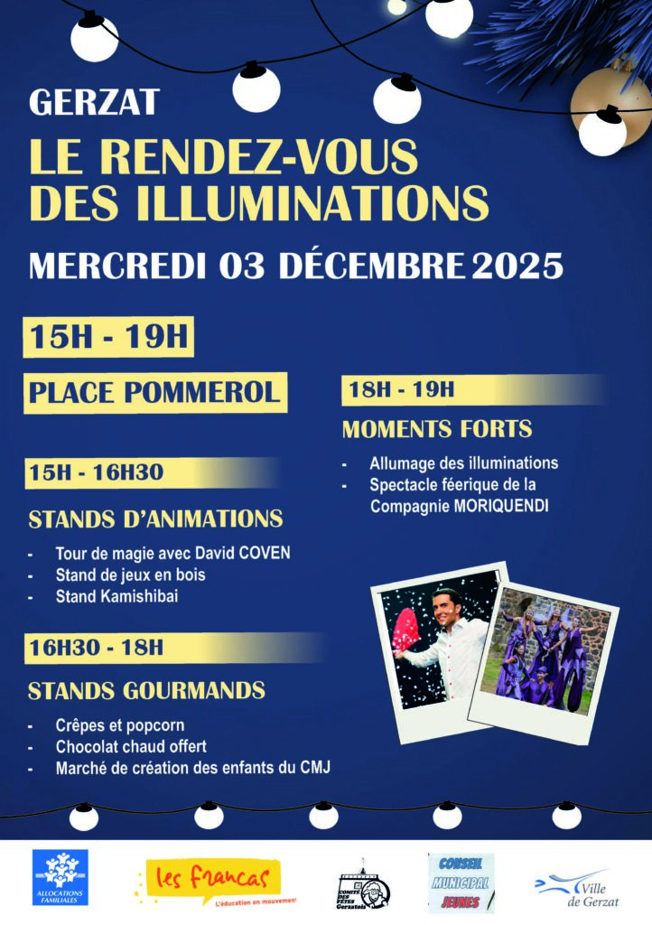 3 décembre 2025(4 évènements) 12:00 : Sirène du SAIP TEST du Système d'alerte et d'information des populations I SAIP Comme tous les premiers mercredis de chaque mois, les sirènes #SAIP retentiront ce mercredi 5 novembre à 12 h Il ne s'agit bien que d'un essai de fonctionnement. Retrouvez les significations des différentes alertes ![]() Connaissez-vous les comportements à adopter si ce signal venait à retentir ? 13:30 : 🚲 Permanence C.Vélo – 🚲 Permanence C.Vélo 🚲 Louez votre vélo à assistance électrique avec C.Vélo. Venez vous renseigner ! Vous pouvez aussi joindre C.vélo au 04 73 92 65 08 ou consulter le site Internet www.c-velo.fr. Maison des associations Rue Léon Blum Gerzat, 63360 15:00 : 🌟 RDV des illuminations - Dès 15 h !!! – 🌟 RDV des illuminations 🌟 Les jeunes élus du Conseil Municipal des Jeunes (CMJ) et les enfants inscrits au Service Municipal Enfance Jeunesse (SMEJ) vous invitent au rendez-vous des illuminations de la ville, auxquelles ils ont contribué.