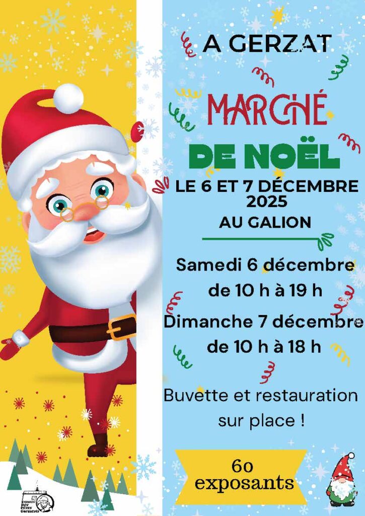 6 décembre 2025(1 évènement) 10:00 : 🎄 Marché de Noël du Comité des Fêtes Gerzatois – 🎄 Marché de Noël Comité des Fêtes Gerzatois 🎄 Le Comité des Fêtes Gerzatois organise son grand marché de noël annuel samedi 6 (10 h 19 h) et dimanche 7 (10 h 18 h) décembre, à la salle des fêtes Le Galion, place Marcel Collange.