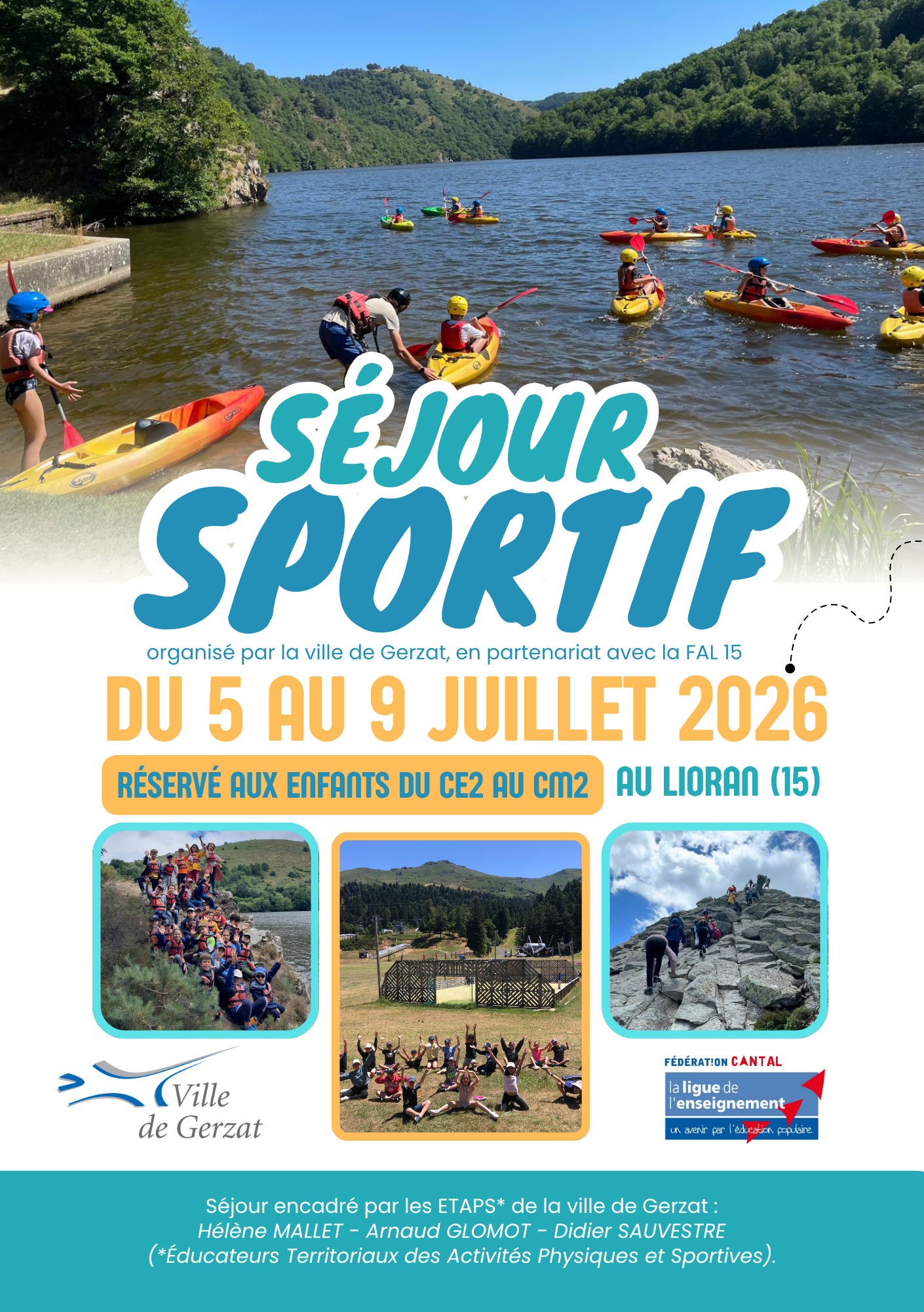 Du 5 au 9 juillet (5 jours), 24 enfants du CE2 au CM2 pourront participer à un séjour sportif au Lioran (15), encadré par les ETAPS (Éducateurs Territoriaux des Activités Physiques et Sportives) de la ville de Gerzat : Hélène MALLET, Arnaud GLOMOT et Didier SAUVESTRE.